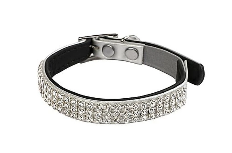 Collier pour chat en simili cuir argent, incrusté de strasses, cousu sur du simili cuir souple noir.