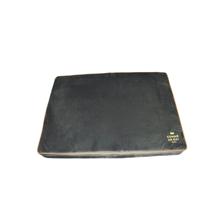 Matelas super confortable grâce à un rembourrage de mousse polyester de haute densité et épaisse, déhoussable et lavable. Le matelas So chic Comme Un Roi est en velours coton/polyester brun anthracite avec des liserés fauve, et une broderie dorée  » Comme un Roi  » en angle.