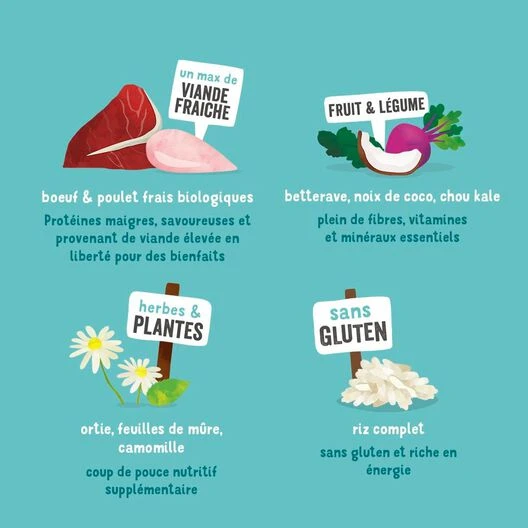 Boeuf et poulet frais bio, avec des legumes, fruits et herbes bioL’élevage bio répond à des normes plus strictes en termes de bien-être animal. Les animaux sont élevés en plein air et avec beaucoup d’espace pour qu’ils puissent s’épanouir et grandirL’agriculture bio contribue à lutter contre le changement climatique en maintenant le carbone dans le sol. Elle protège également les plantes, les insectes et les oiseauxSans ingrédients génétiquement modifiés ni conservateurs artificiels ni pesticides, la nourriture bio est le choix le plus sûr pour votre animal