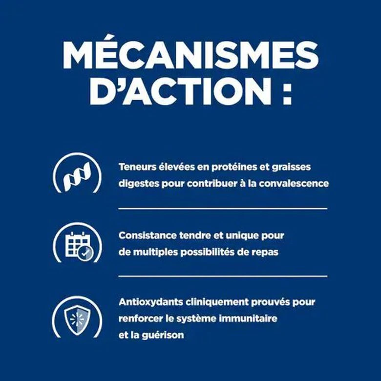 Teneurs élevées en protéines et graisses digestibles pour favoriser la convalescenceConsistance onctueuse, molle, humide et unique, le fait de remuer le produit le rend plus liquide, pour permettre de multiples options d’alimentationDes antioxydants cliniquement prouvés pour soutenir la fonction immunitaire et la guérison