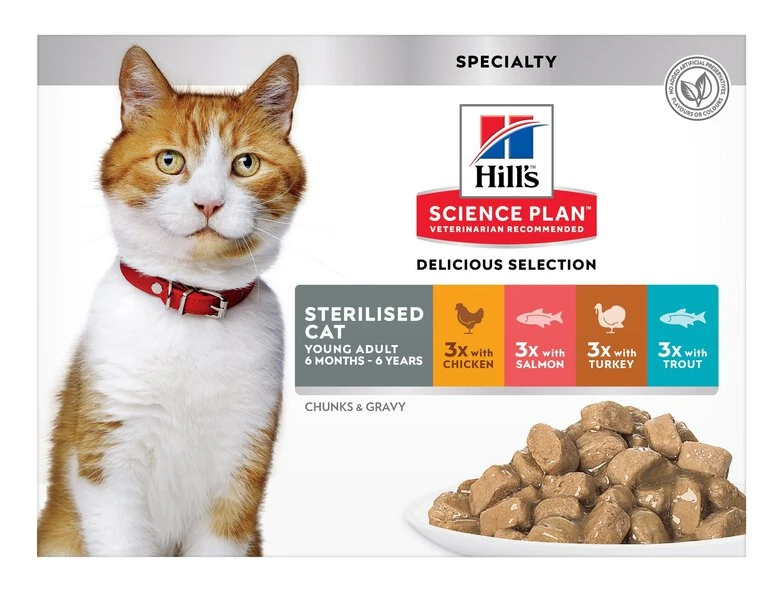 Notre sélection de Bouchées en Sauce Hill’s(TM) Science Plan(TM) Feline Young Adult Chats Stérilisé comprend des sachets repas au Poulet, Saumon, Dinde et Truite. Répond aux besoins spécifiques des jeunes Chats stérilisés, âgés de 6 mois à 6 ans.