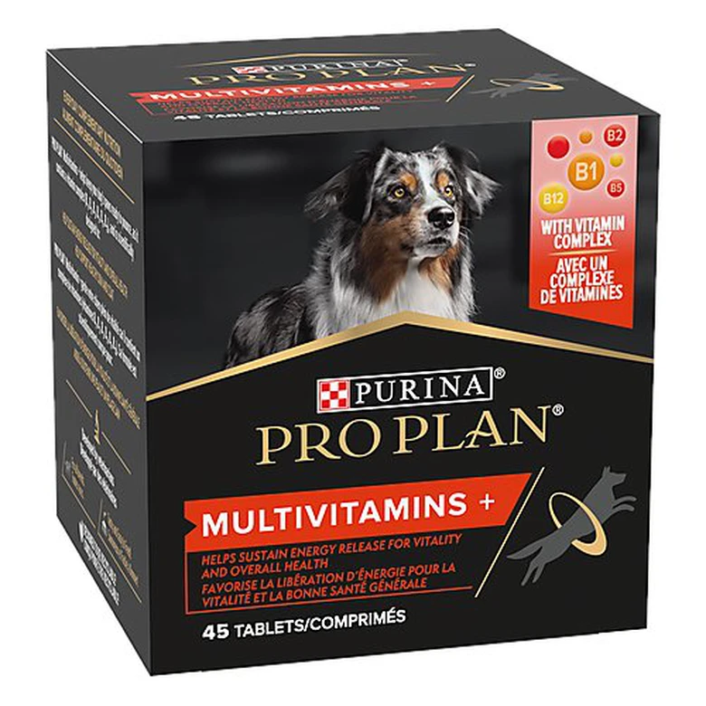 PRO PLAN Multivitamin+ garde votre chien plein de vitalité car il contient un complexe de vitamines (vitamines B1, B2, B3, B5, B6, B12). Sa formule est scientifiquement conçue pour : Favoriser la libération d’énergie pour la vitalité et la bonne santé générale. Aider à soutenir une peau et un pelage sain.