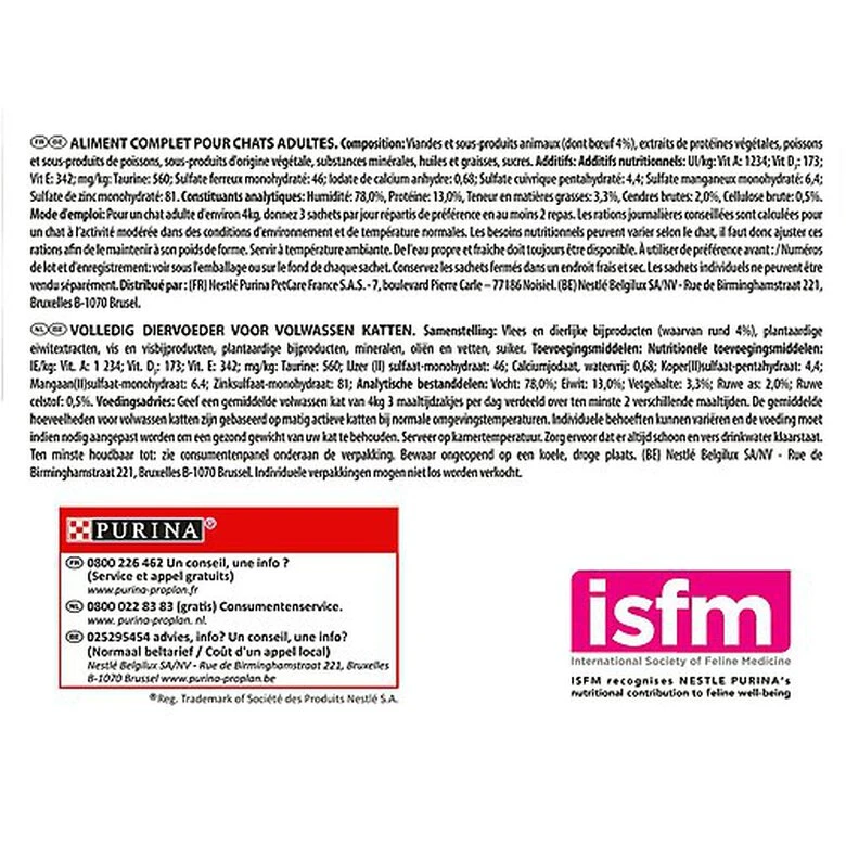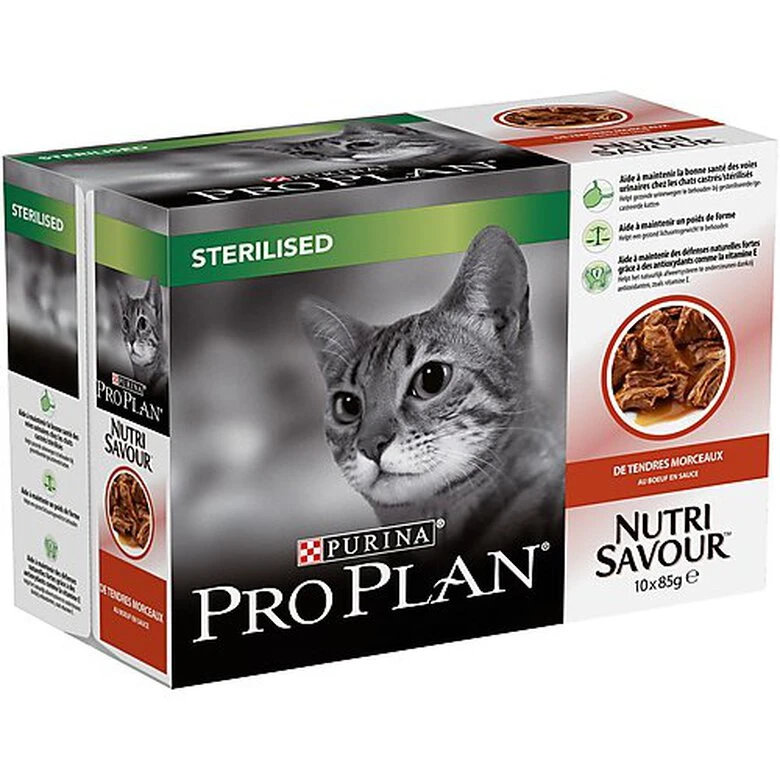 Aliment complet pour chats adultesAliment complet pour chats adultes castrés/stérilisésDe tendres morceaux au B½uf en SauceAide à maintenir la bonne santé des voies urinaires chez les chats stérilisés/castrésAide à maintenir un poids de formeAide à maintenir des défenses naturelles fortes grâce à des antioxydants comme la vitamine E