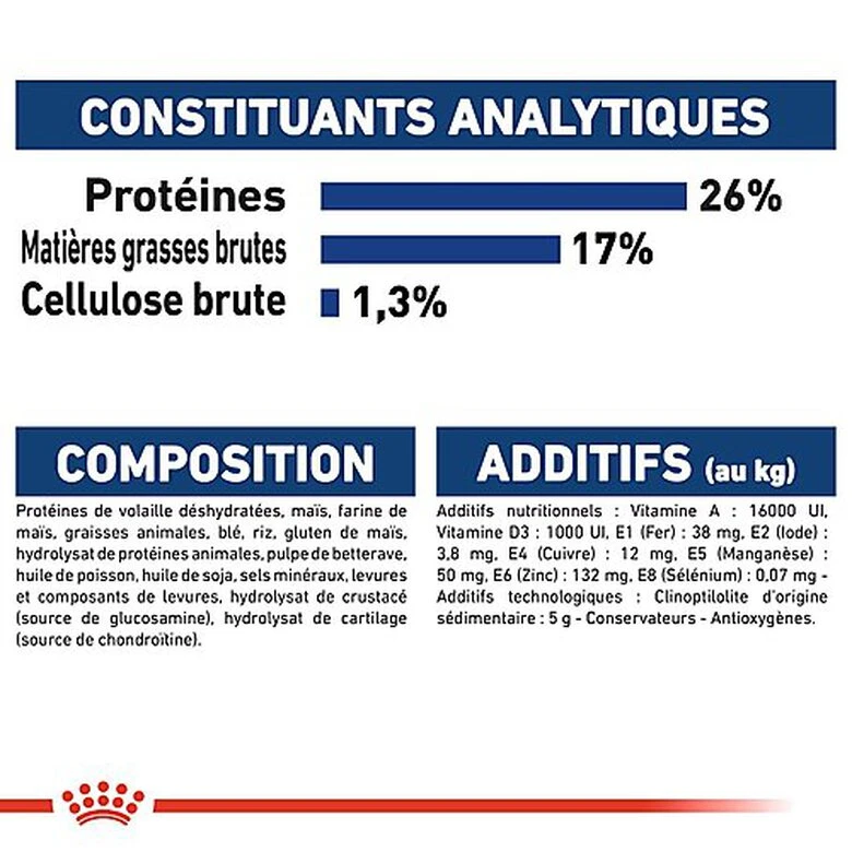 SOUTIEN DU CAPITAL OSTÉO-ARTICULAIRE : Contribue à la bonne santé des os et articulations particulièrement sollicités chez les chiens de grande taille.