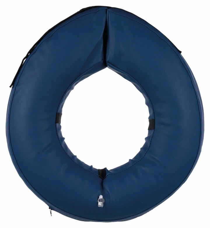 La collerette gonflable de la marque Trixie est parfaite pour protéger les blessures et eczémas d’être léchées ou mordillées (voir zone rouge concernée sur l’illustration du produit ci-dessus) par votre chien et remplace ainsi le traditionnel cône en plastique du retour d’opération. Contrairement à ce dernier, la collerette gonflable permet à votre animal de voir et entendre sans altération et évite donc tout risque de rester coincé ou de se cogner aux objets, murs et escaliers. Cette collerette est idéale pour les chiens anxieux, qui n’aiment pas la collerette classique et qui leur permet ainsi à votre chien de manger, boire, renifler et jouer sans restriction !