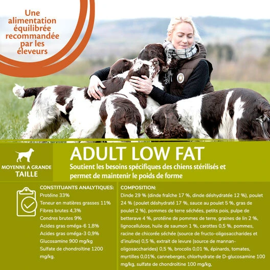 Cet aliment est pauvre en allergènes : il ne contient pas de céréales, de gluten de blé, de maïs, de soja, de produits laitiers, d’½ufs et de b½uf.