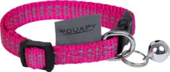 Ensemble pour chaton, harnais réglable avec grelot, laisse et collier avec sangle nylon fuchsia et 3 rangées de fils réfléchissants, avec étiquette wouapy drapeau réfléchissante cousue sur le harnais, la laisse et le collier.